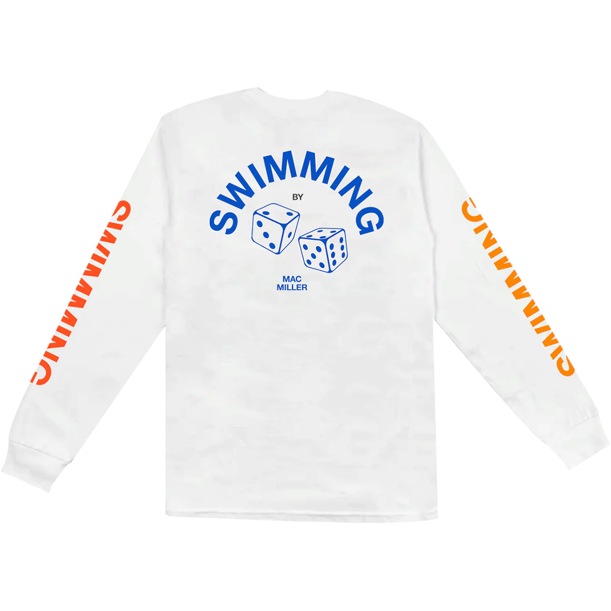 Swimming Dice designs printed on the front left, back and sleeves of a white unisex long sleeve tee.