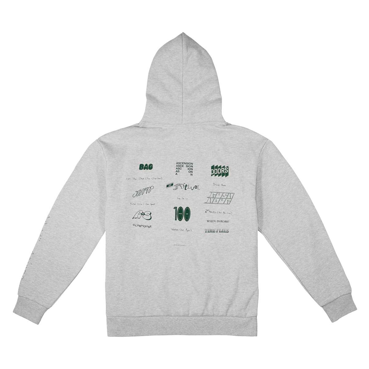 GO:OD AM DESIGNS EMBROIDERED ON THE FRONT AND PRINTED ON THE BACK AND SLEEVE OF A HEATHER GREY UNISEX HOODIE.